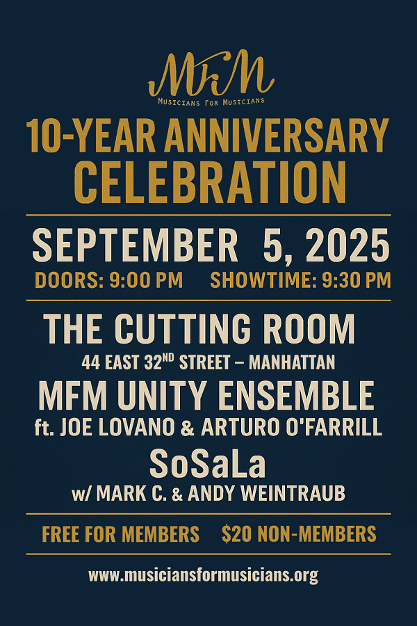 Musicians For Musicians (MFM), a nonprofit association advocating for the rights, recognition, and fair pay of freelance and independent musicians, proudly announces its 10-Year Anniversary Celebration on Friday, September 5, at The Cutting Room in New York City. This special event kicks off at 9:00 p.m., with musical performances starting at 9:30 p.m.; tickets are free for MFM members, and $20 for non-members.